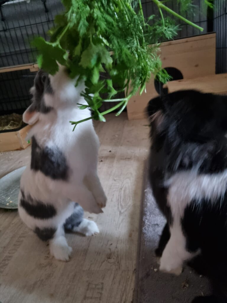 Als wir dann irgendwann endlich Frühstück bekommen haben, mussten wir feststellen, dass wieder mal einiges gefehlt hat. So gab es beispielsweise keine Petersilie, obwohl wir genau wissen, dass welche da ist. Allerdings hat Mama ihren Fehler schon eingesehen und uns zum Nachmittag einen kleinen Strauß voller Kräuter gegeben. Nur sagte Mama dazu, dass es Lotti eigentlich nicht verdient habe, denn sie buddelte heute wieder fleißig in der Toilette rum. Mama hat einige Male mit ihr geschimpft, aber das hat Lotti nicht interessiert. Irgendwann wurde Lotti aber plötzlich nass und weil sie dickes Fell hat und sowas erst recht spät bemerkt, war sie dann sogar sehr nass. Wo auch immer der Regen wieder herkam, gebuddelt hat sie seither nicht nochmal. Ich hoffe, dass sie das jetzt auch sein lässt. So ist es doch viel schöner.
